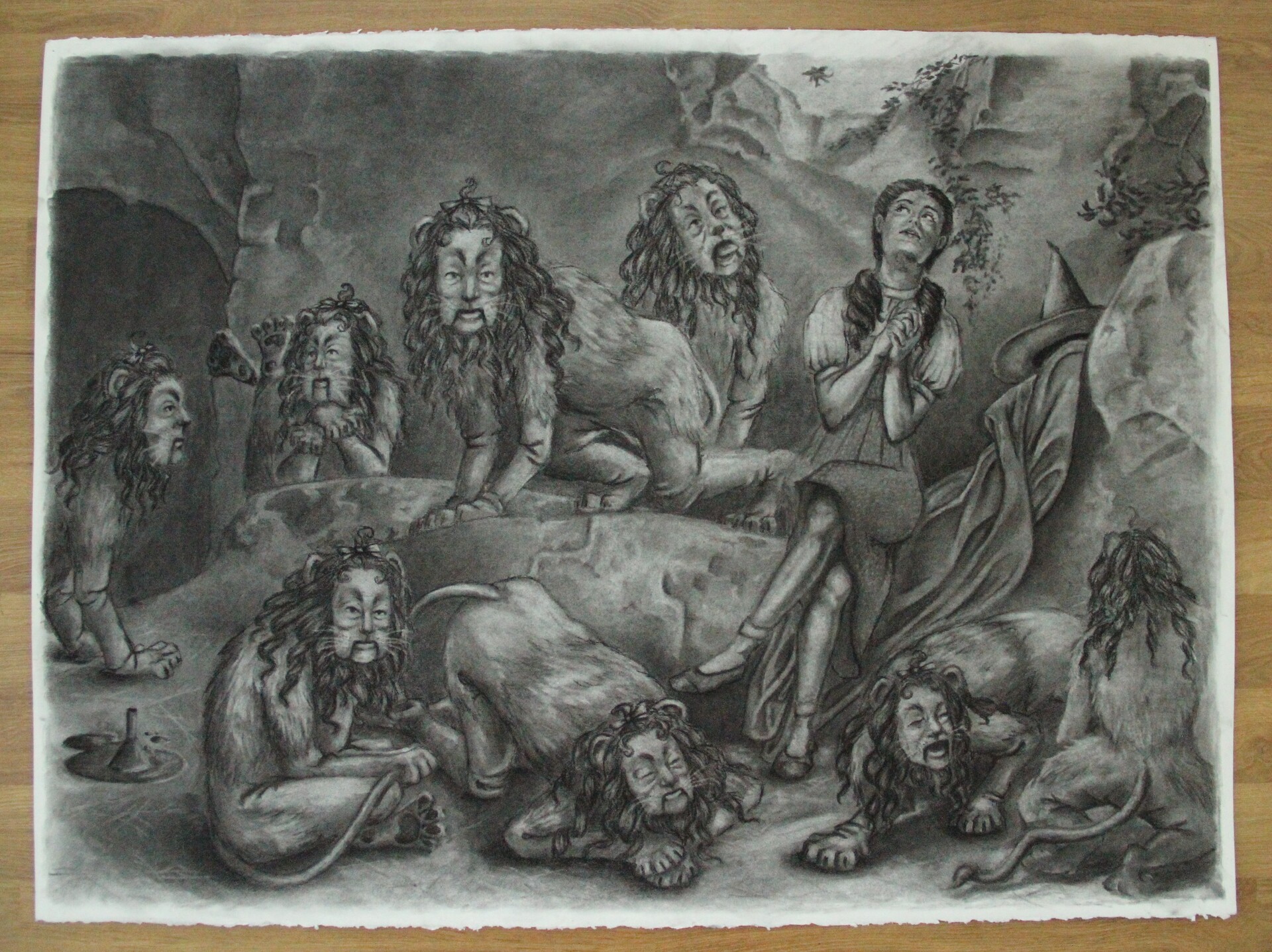 A Master copy of Daniel in the lion's den blended with The Wizard of Oz. 22 x 30 in, charcoal.